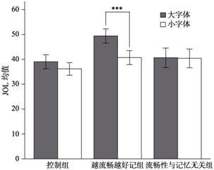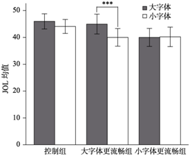 图2  实验1字体大小和组别的交互作用(图中误差线为标准误, ***表示p< 0.001)