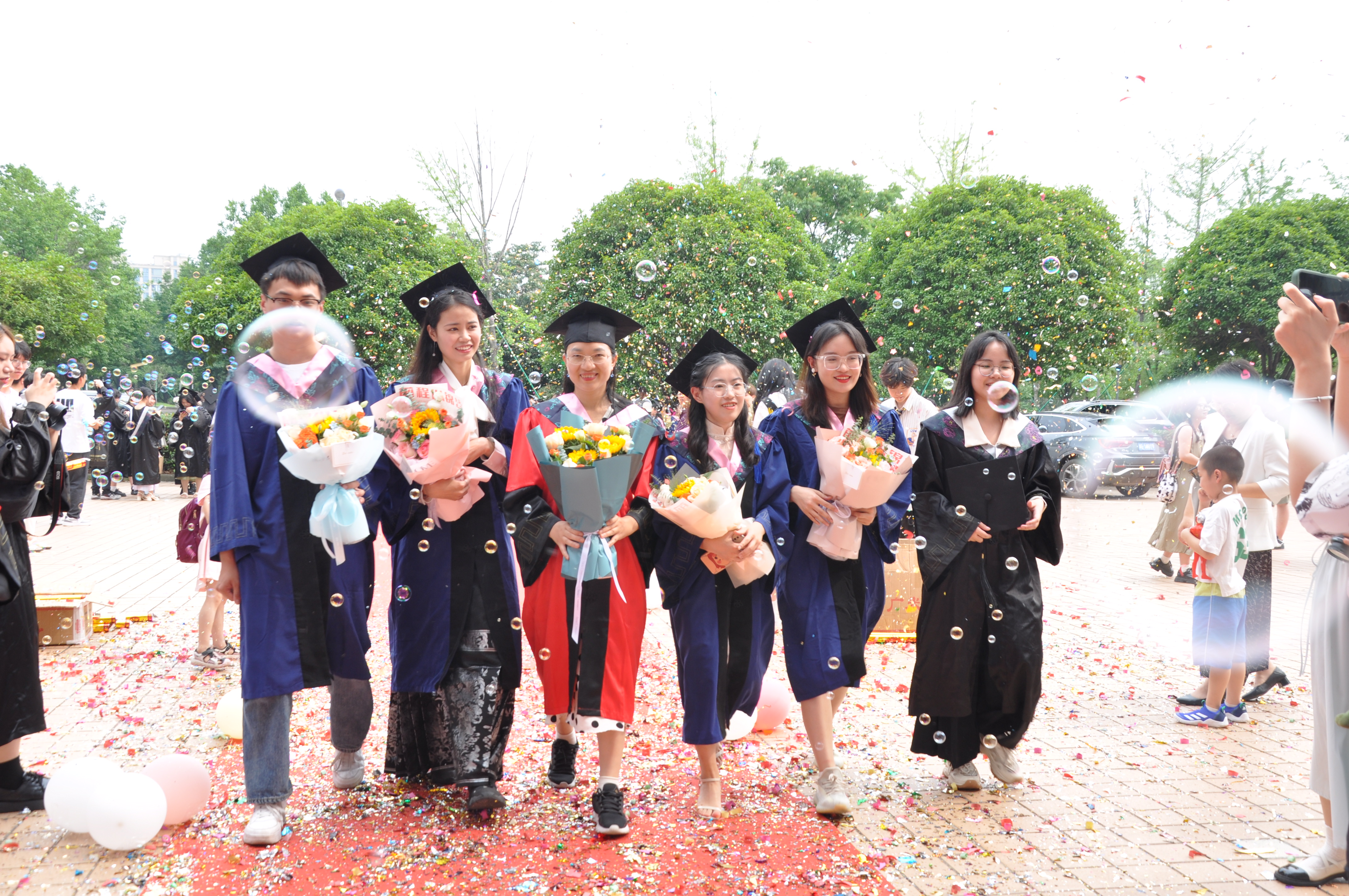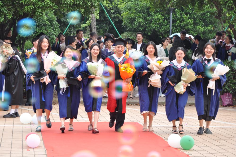 迎朝阳,走花路。典礼开始前,毕业生在导师、班主任的带领下、在广大同学的欢乐与祝福中,昂首走上心理红毯,接受礼炮的洗礼,冲过五彩的气泡墙,并在大门口的展板边签字合影。炮声隆隆,庆贺走下四年时光;彩带飞舞,指向无尽未来