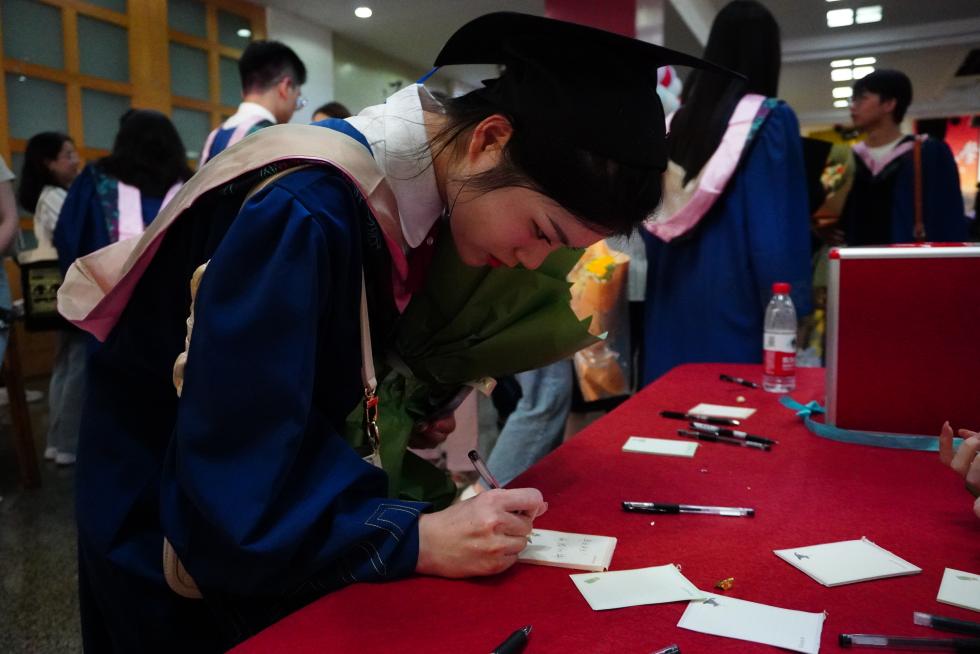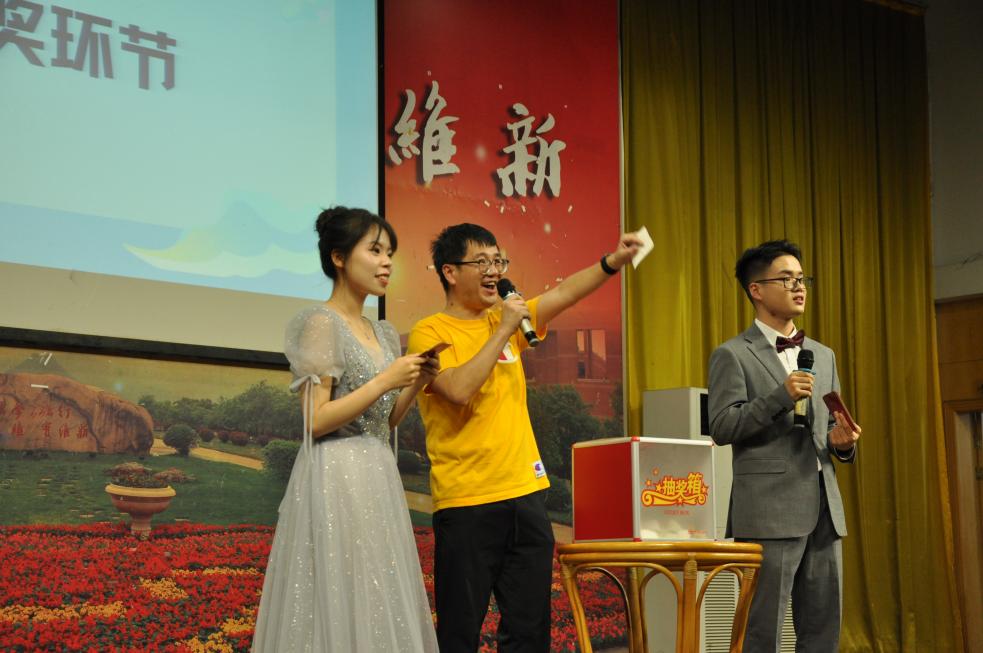 典礼也记录了每一位毕业生对浙师生活的寄语和留言。节目间隙,激动人心的抽奖环节一次次将现场气氛推至高潮。李新宇老师与李庆功老师分别抽取了三位幸运儿,分享了他们写下的祝福,并为这些幸运儿送去精美礼品。