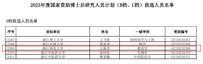 1218日,全国博士后管委会办公室、中国博士后科学基金会发布了《关于印发2023年度国家资助博士后研究人员计划(B档、C档)获选结果的通知》,我院博士后王换芳主持的项目《“双减”改革中的教师情绪劳动困境:现状、机制与干预路径研究》获C档资助,也是本次我校获得的唯一的项目,项目合作导师为李伟健教授。
